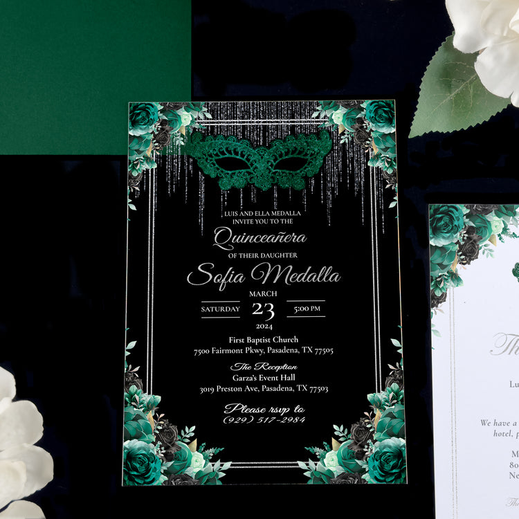 Masquerade - Emerald Green + Silver Acrylic Quinceañera Invitations