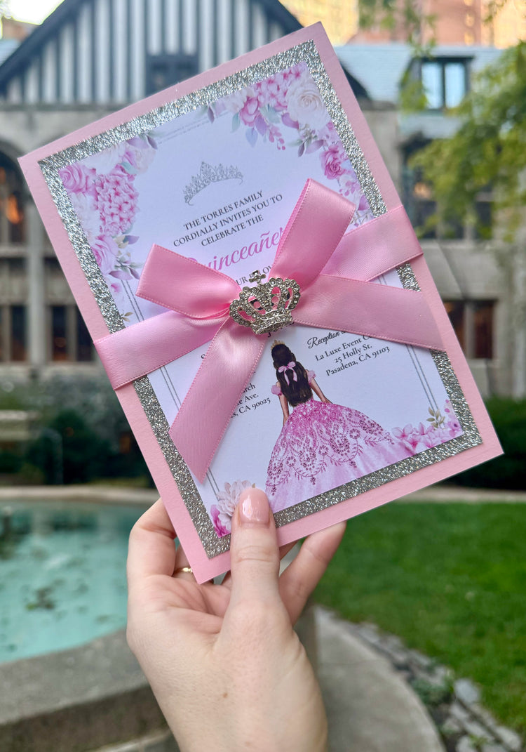 Create your perfect Quinceañera invitations using our custom designer! The Carmela invitation set includes a colored backing card, glitter backing card, white card with your printed design, self-sealing ribbon, and white envelopes to hold it all together! Add on a crown charm, rsvp cards, details cards, assembly by us, and more at checkout.