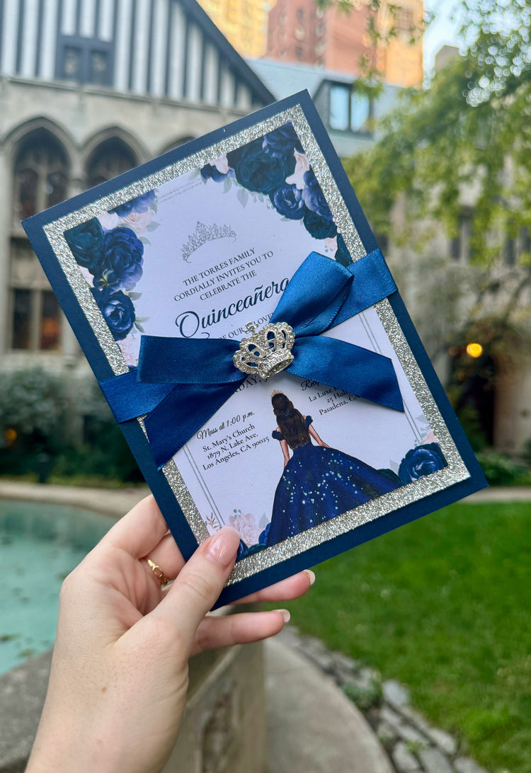 Carmela - Royal Blue and Gold Glitter Quinceañera Invitations