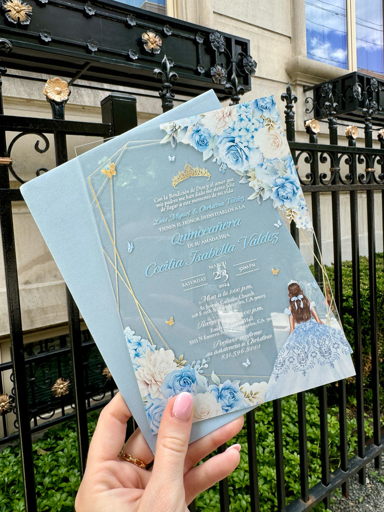 Celeste- Baby Blue Gold Acrylic Quinceañera Invitations