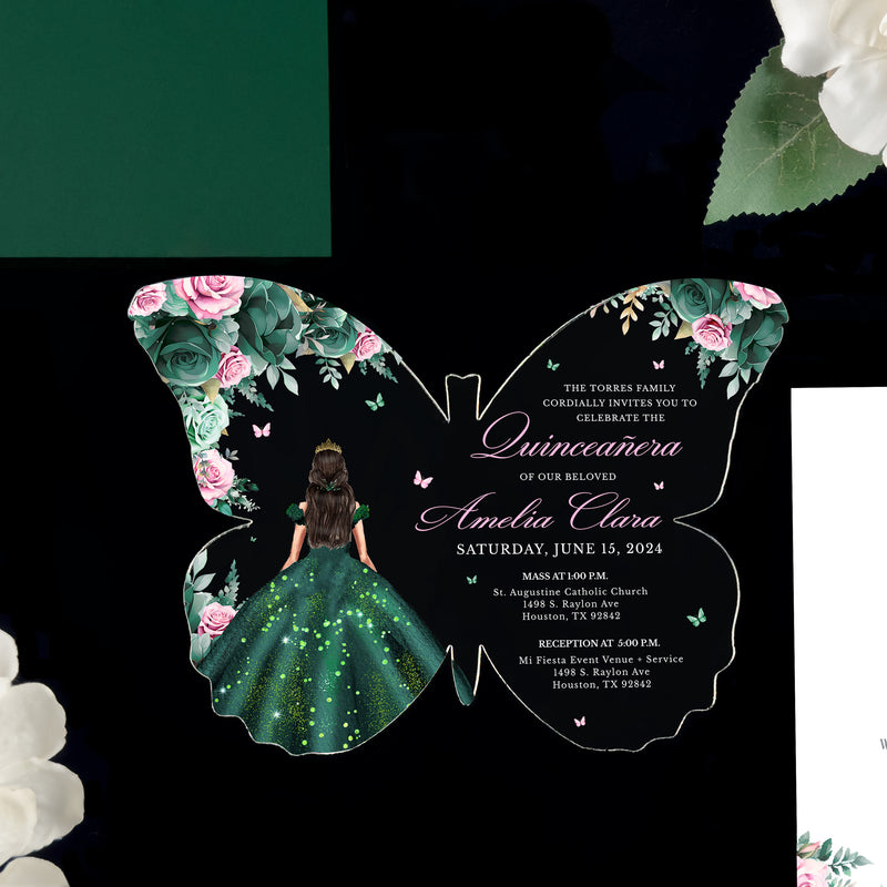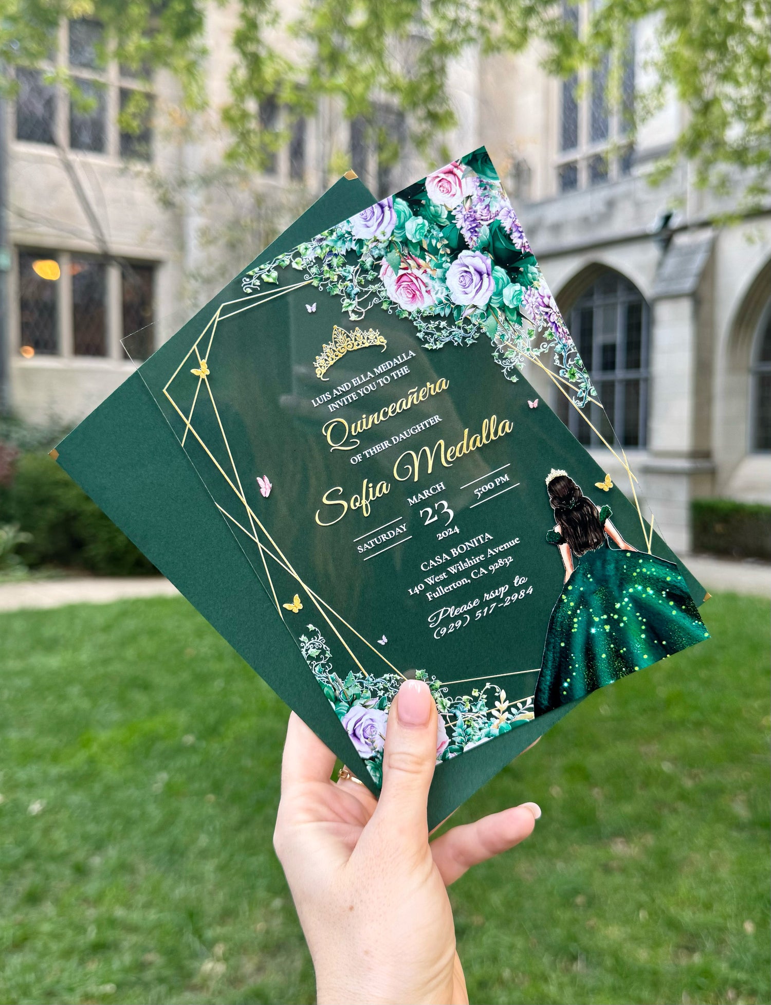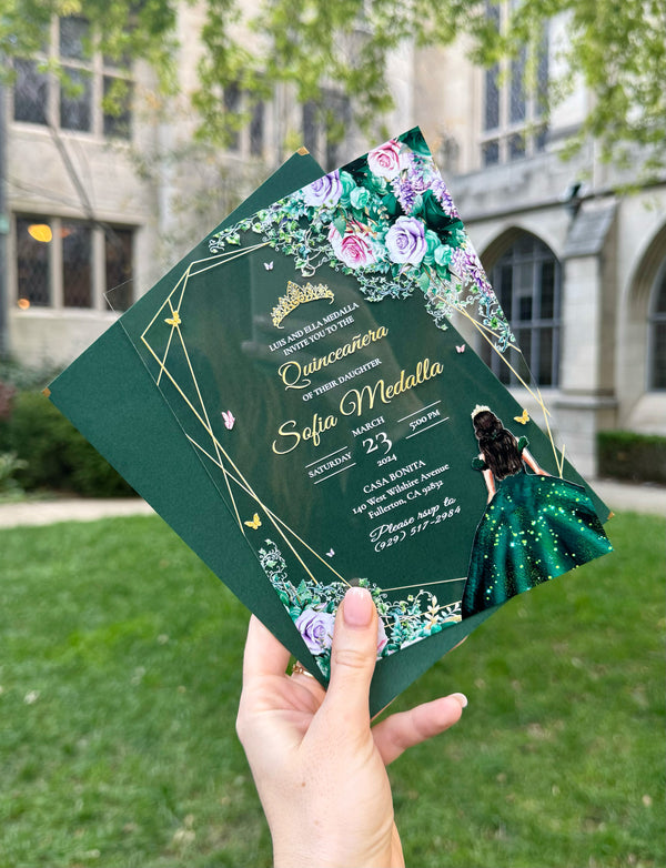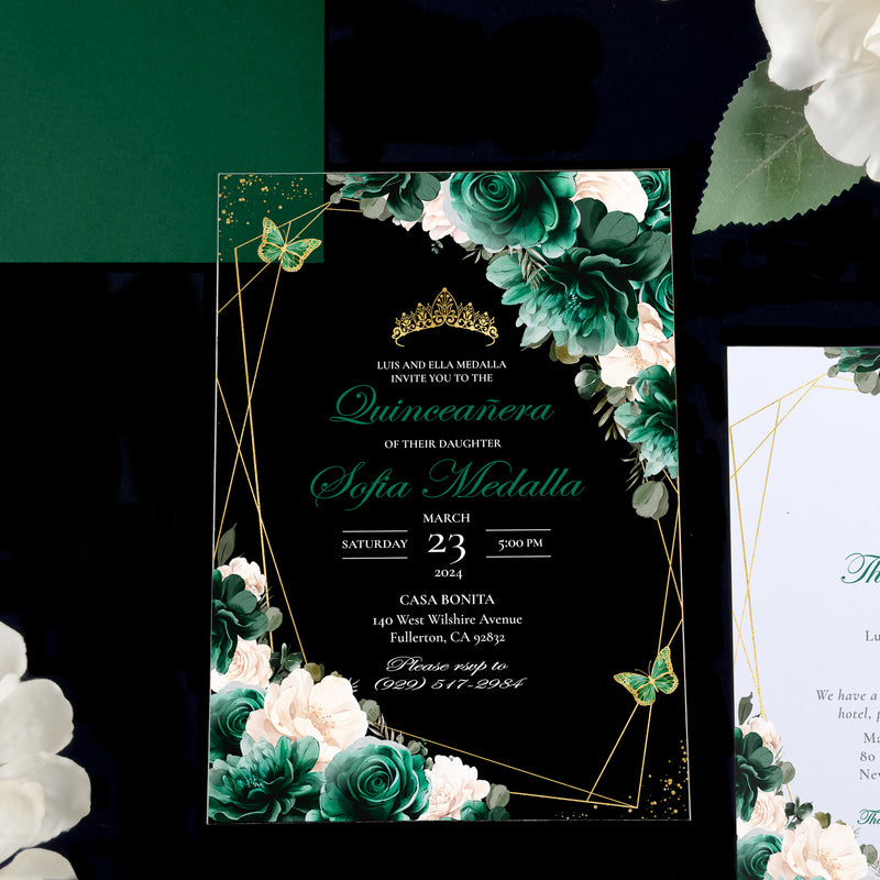 Emerald Green Enchanted Garden Acrylic Quinceañera Invitations
