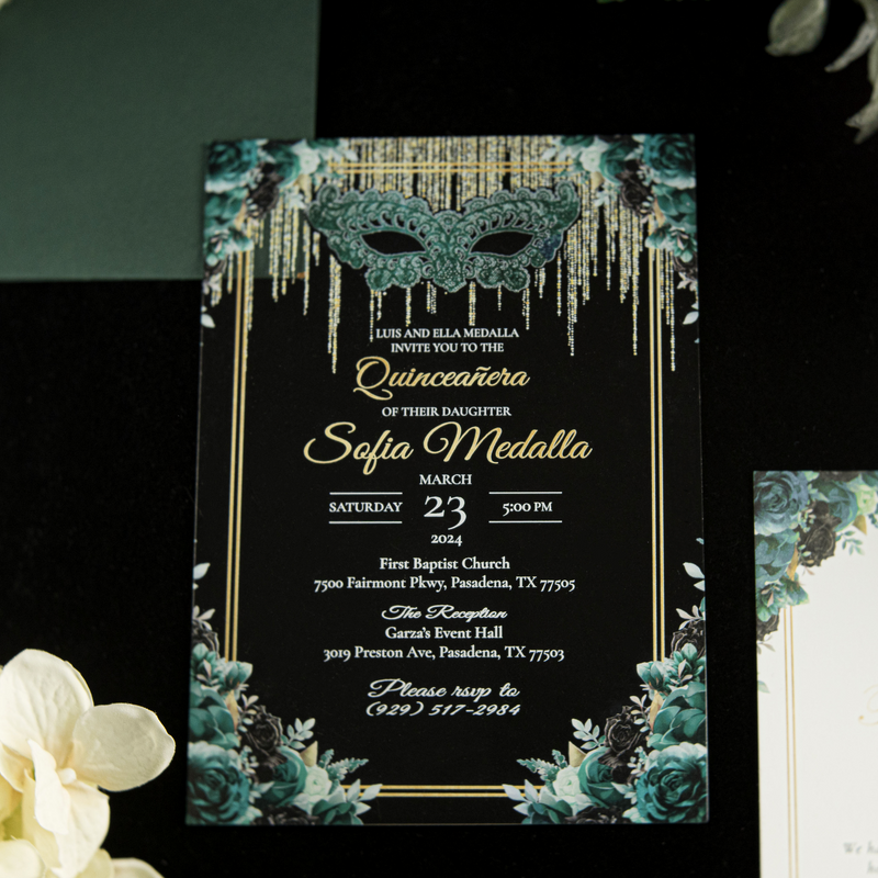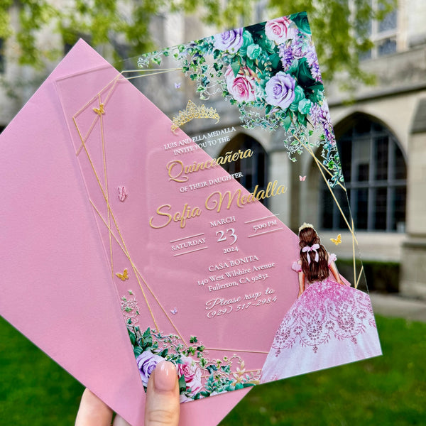 Create your perfect Quinceañera invitations using our custom designer! All of our invitations are printed on 1mm thick clear acrylic for a luxe feel and include envelopes in a complementary color.