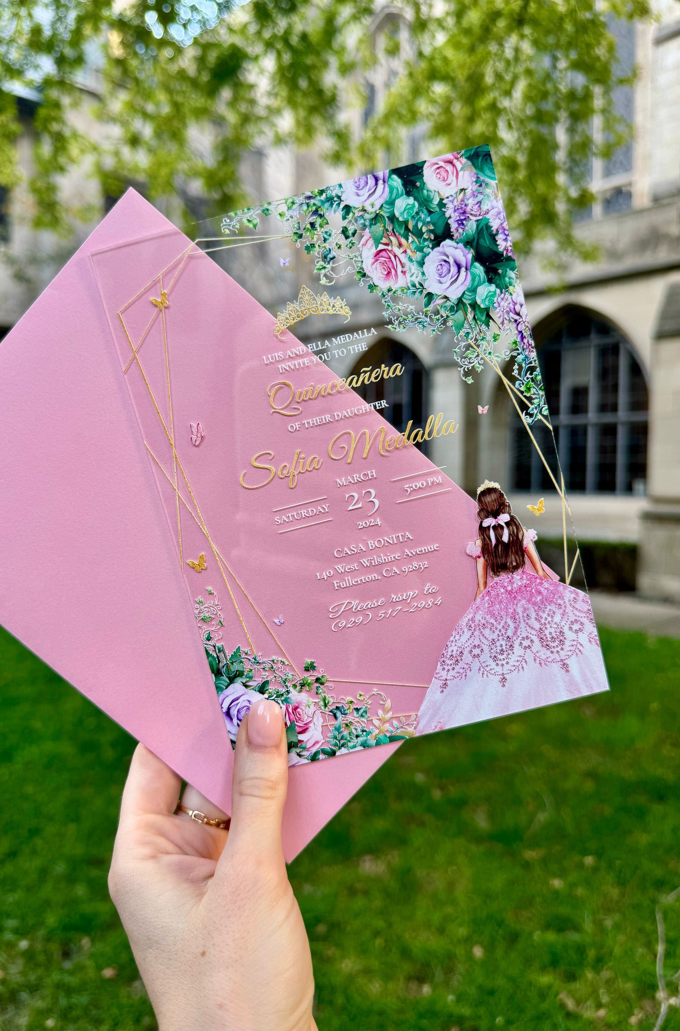 Create your perfect Quinceañera invitations using our custom designer! All of our invitations are printed on 1mm thick clear acrylic for a luxe feel and include envelopes in a complementary color.