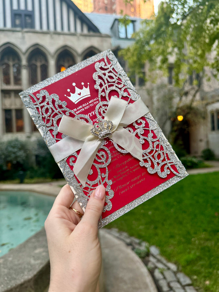 Create your perfect Quinceañera invitations using our custom designer! The Josephine invitation set includes a colored backing card, glitter backing card, white card with your printed design, self-sealing ribbon, and white envelopes to hold it all together! Add on a crown charm, rsvp cards, details cards, assembly by us, and more at checkout.