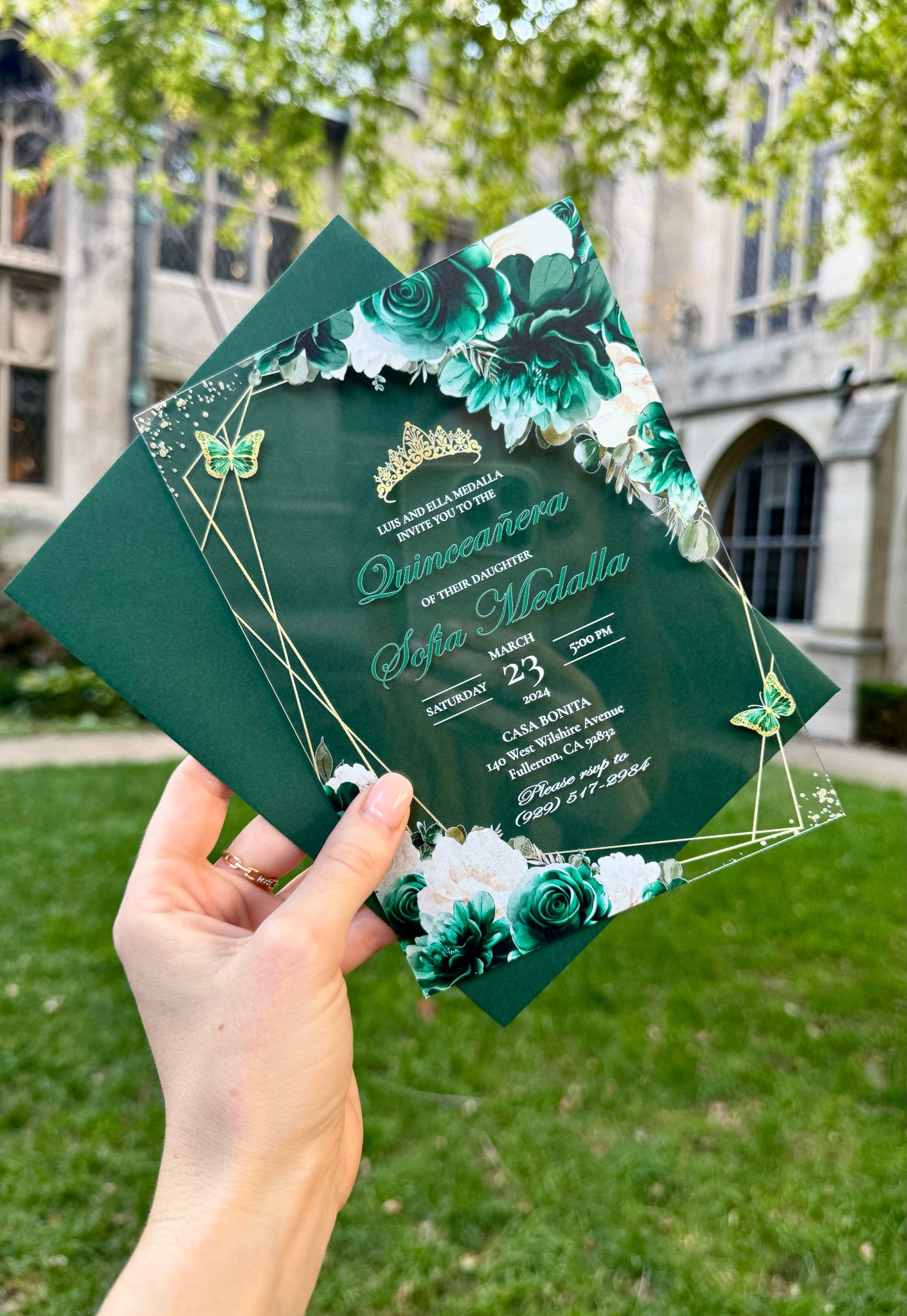 Leila - Emerald + Gold Acrylic Quinceañera Invitations