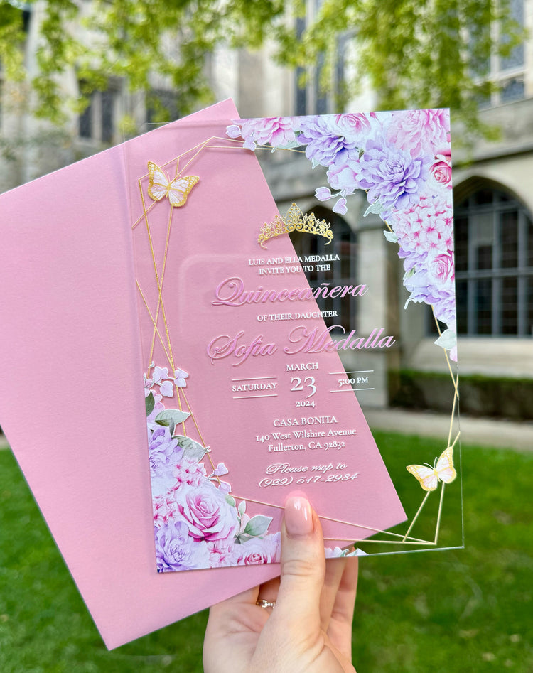 Leila - Lavender & Pink + Gold Acrylic Quinceañera Invitations