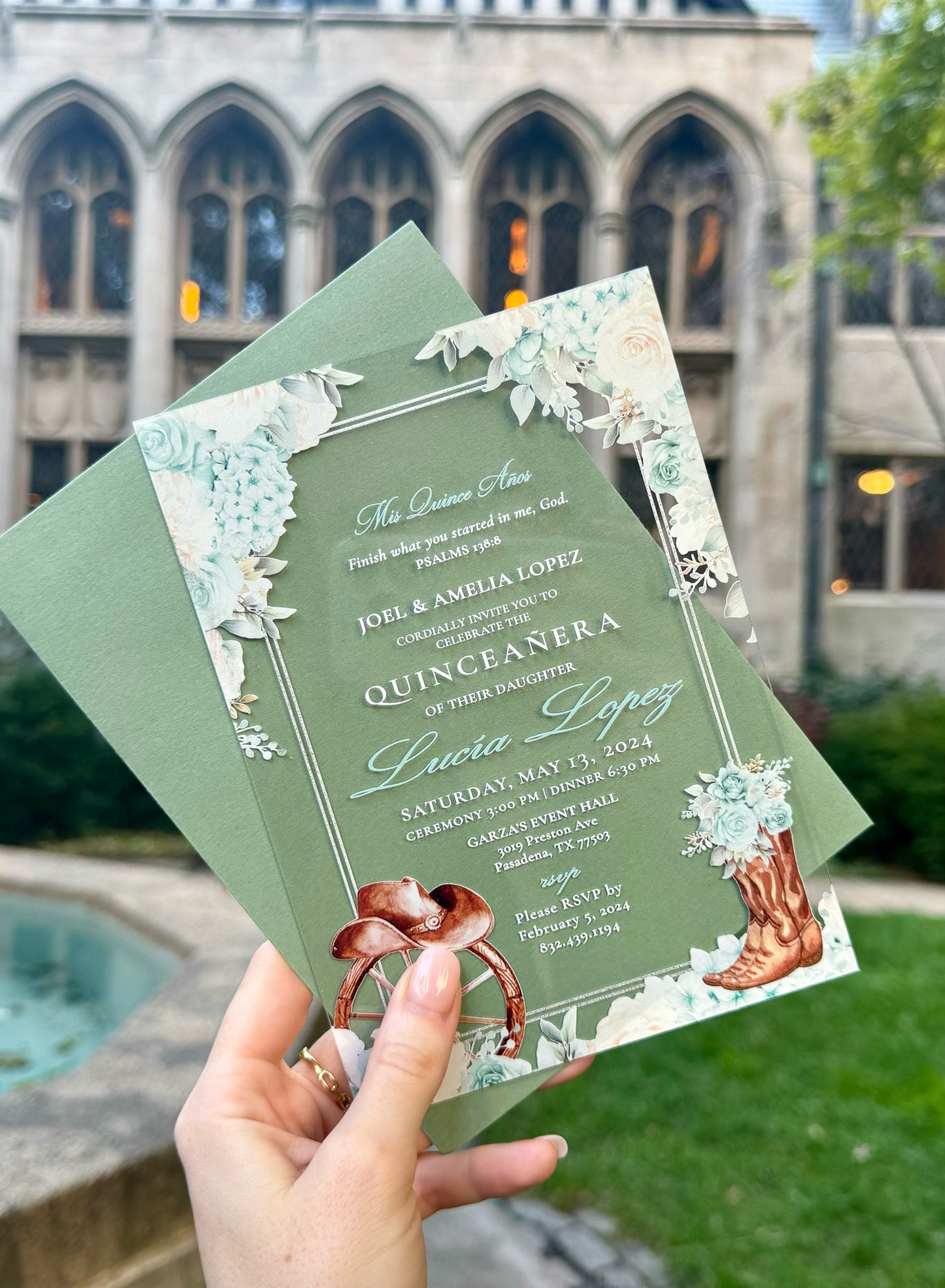 Western - Sage Silver Acrylic Quinceañera Invitations