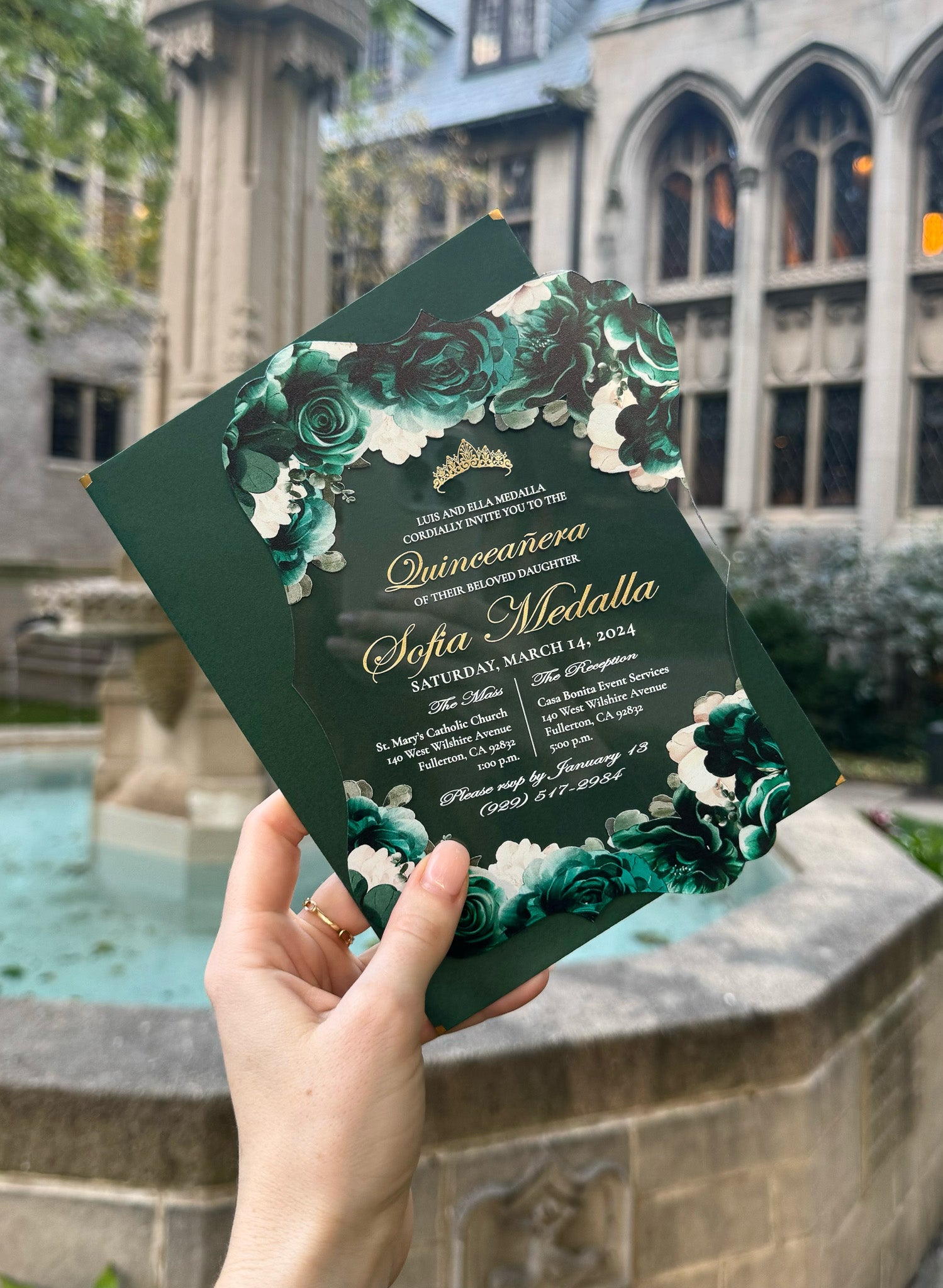 Ximena - Emerald + Silver Acrylic Quinceañera Invitations