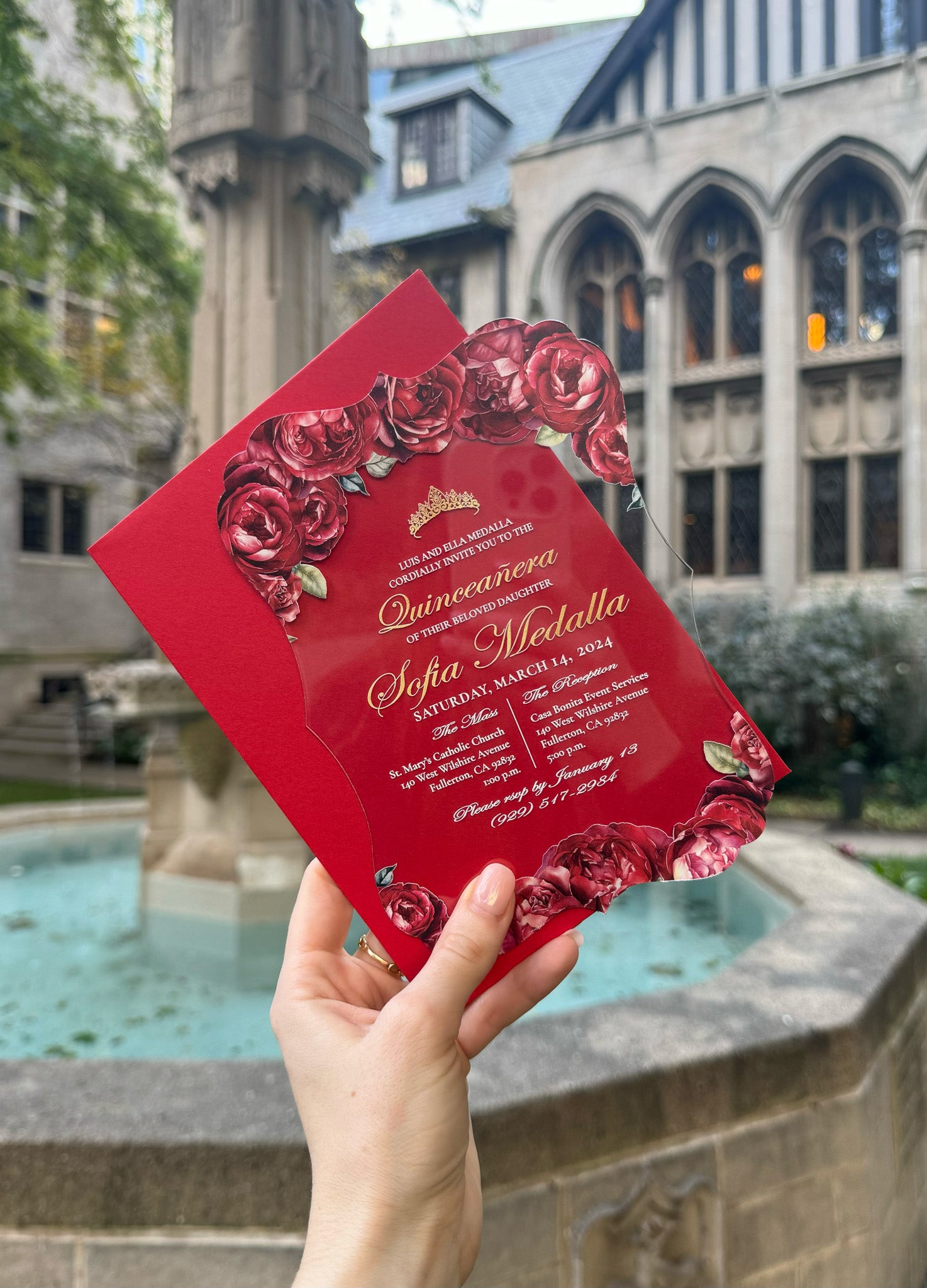 Ximena - Red + Gold Acrylic Quinceañera Invitations